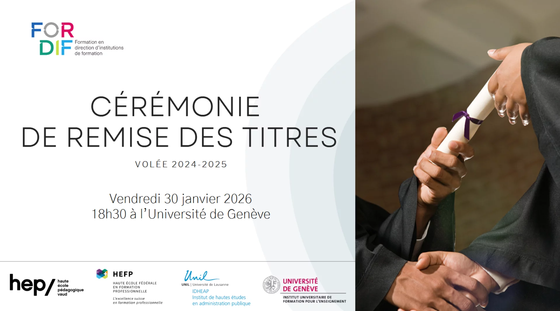 Nous avons le plaisir de vous convier à la cérémonie de remise des titres de la FORDIF qui se tiendra le vendredi 30 janvier 2026 dès 18h30 à l’Université de Genève.